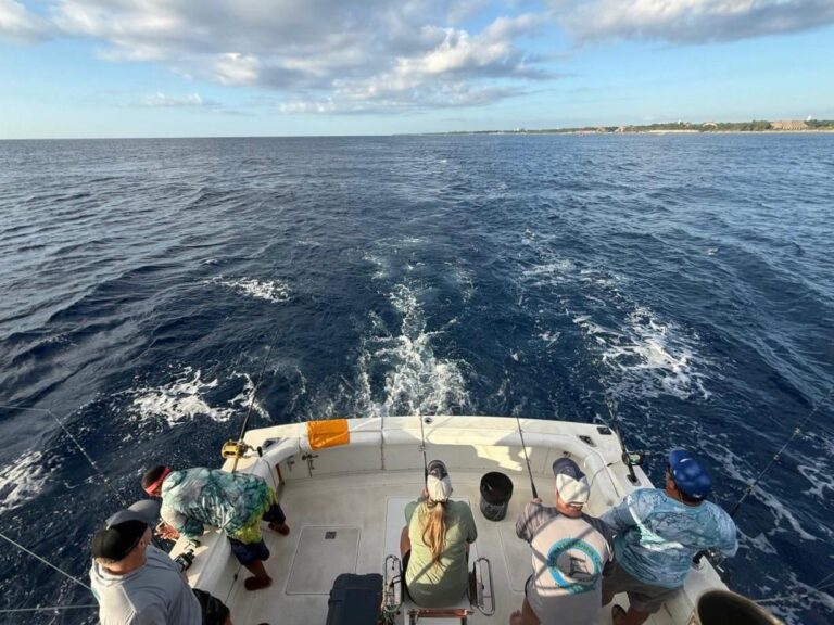 Report: An early morning start allowed u to watch the sunrise as we dropped our lines in the water. It was a beautiful start to the day. And we saw some action: wahoo, skipjack tuna, barracuda and bonito. Afterwards we anchored in the calmer waters of the Puerto Aventuras inlet (caleta) for a well-deserved swim and some food. The inlet at the entrance to the Puerto Aventuras marina is known for its calm, crystal-clear waters. It provides a safe and scenic passage for boats entering and exiting the marina, offering stunning views of the surrounding coastline.